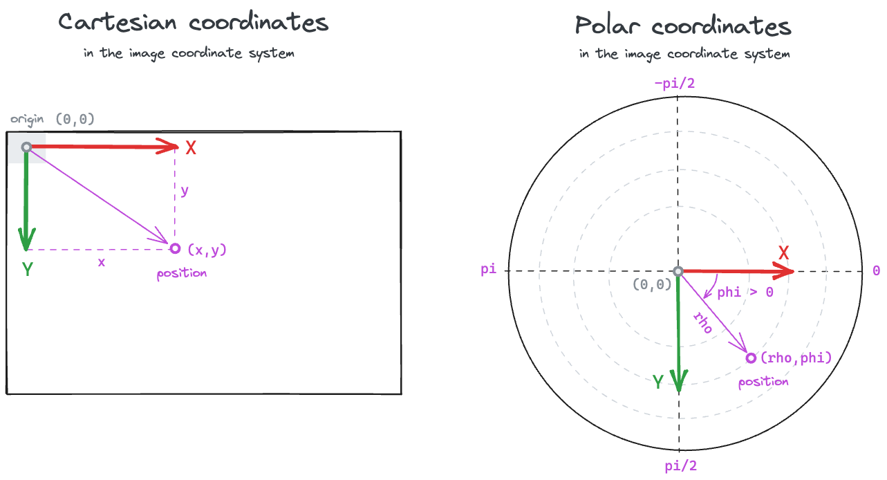 Note that any position data point can be seen as a point \(U\) in the 2D plane, or as a 2D vector \(\vec{u}\) that goes from the image coordinate system origin (by default, the centre of the top-left pixel) to the point \(U\) (see left subplot).
