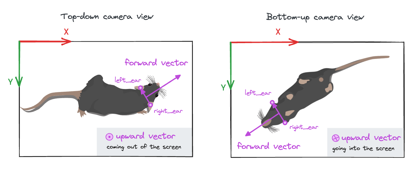 We can define the head direction as the vector from the midpoint between the ears to the snout.