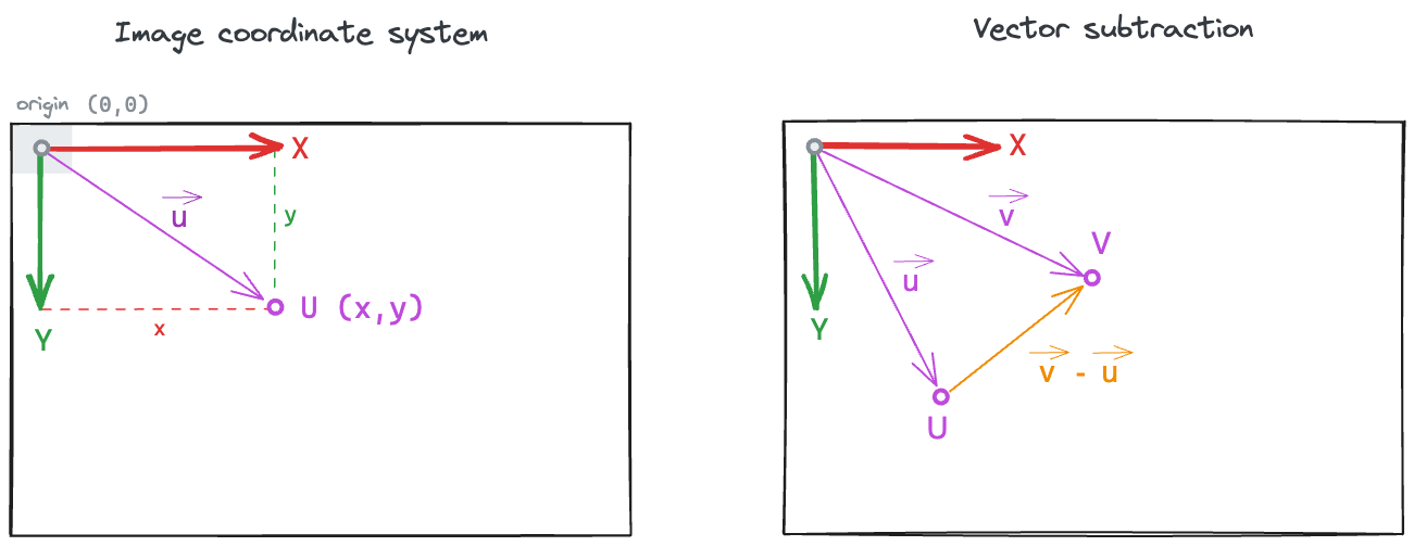The vector that goes from point \(U\) to point \(V\) can be computed as the difference \(\vec{v} - \vec{u}\) (see right subplot).